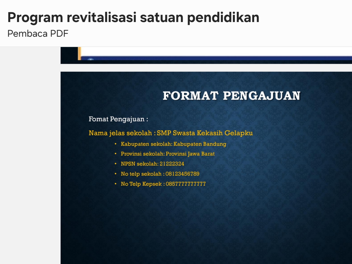 Salah satu poin mencurigakan ialah tercantumnya nama sekolah contoh “SMP Swasta Kekasih Gelapku” pada bagian format pengajuan.